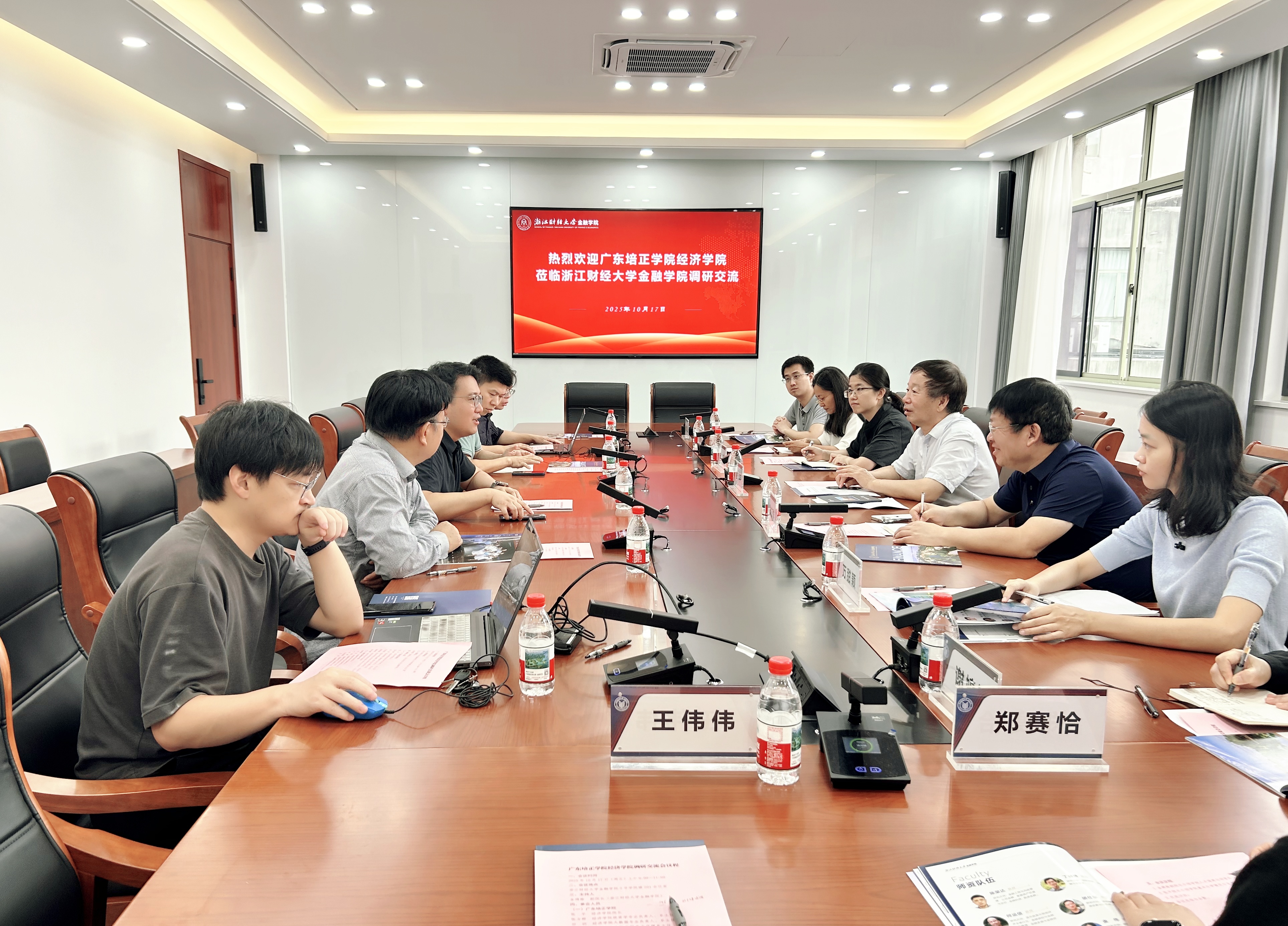 10月17日,广东培正学院经济学院张平院长一行来我院调研交流,学院党委书记朱旭明、副院长金骋路热情接待了来访客人,数据科学学院副院长刘波应邀参加交流。